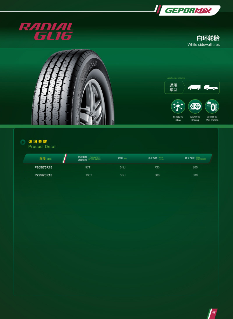 胎側(cè)白環(huán)裝飾,汽車行駛更受矚目,獨特花紋設計,具有良好的排水性能和制動力