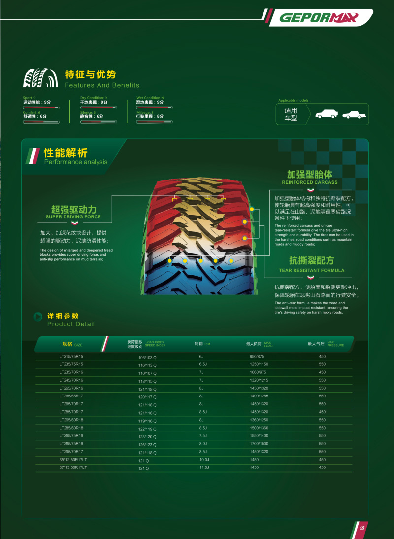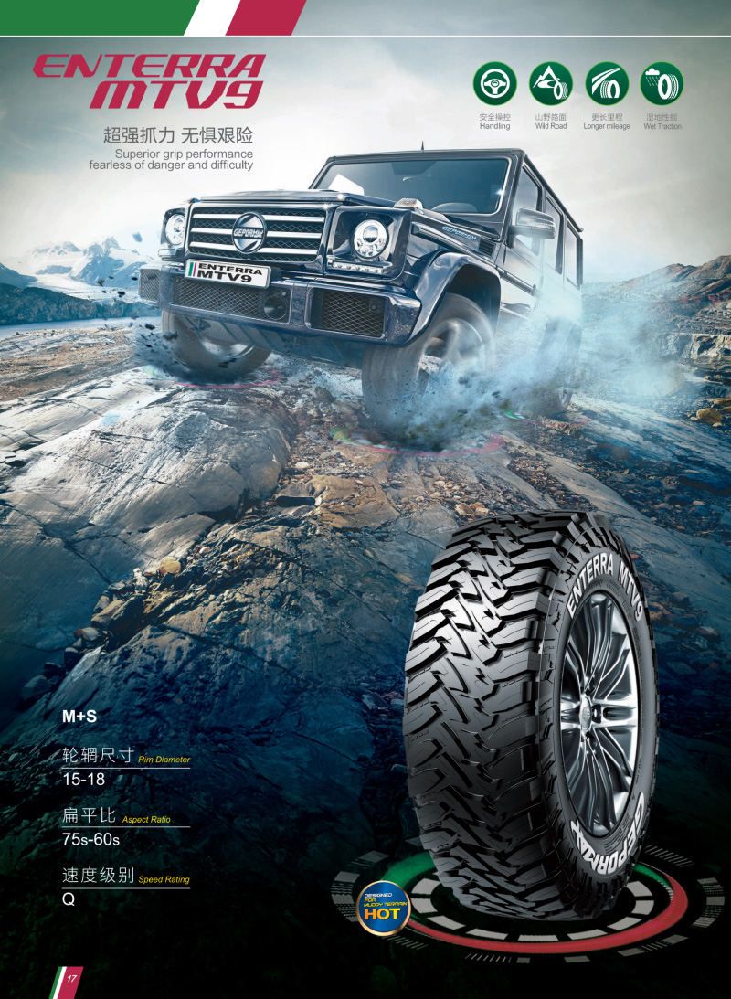 火焰型大塊花紋,是一款用于極限越野的輪胎,惡劣路況下提供超強的驅(qū)動力、泥地防滑性能。