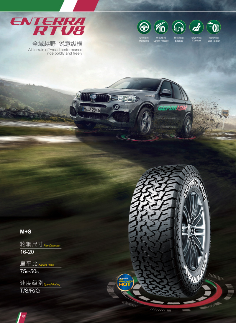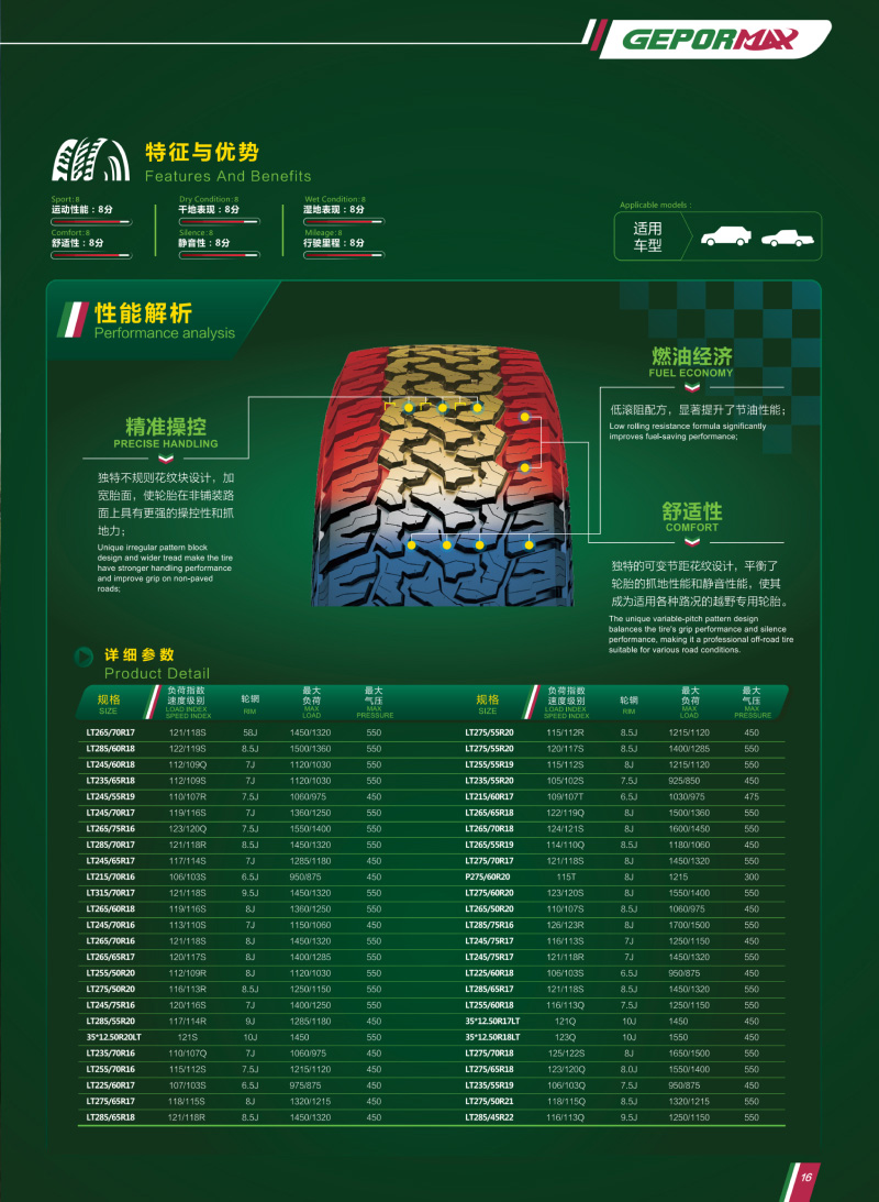 獨特花紋設(shè)計,在非鋪裝路面上具有超強的耐用性和抓地力,是一款適用各種路況的越野專用輪胎。
